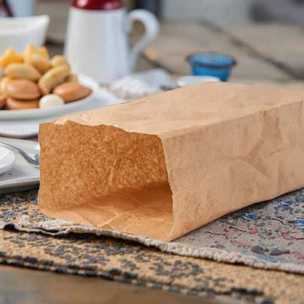 Natural brown kraft paper food bags made from compostable material, suitable for coffee, bread, and snack packaging.