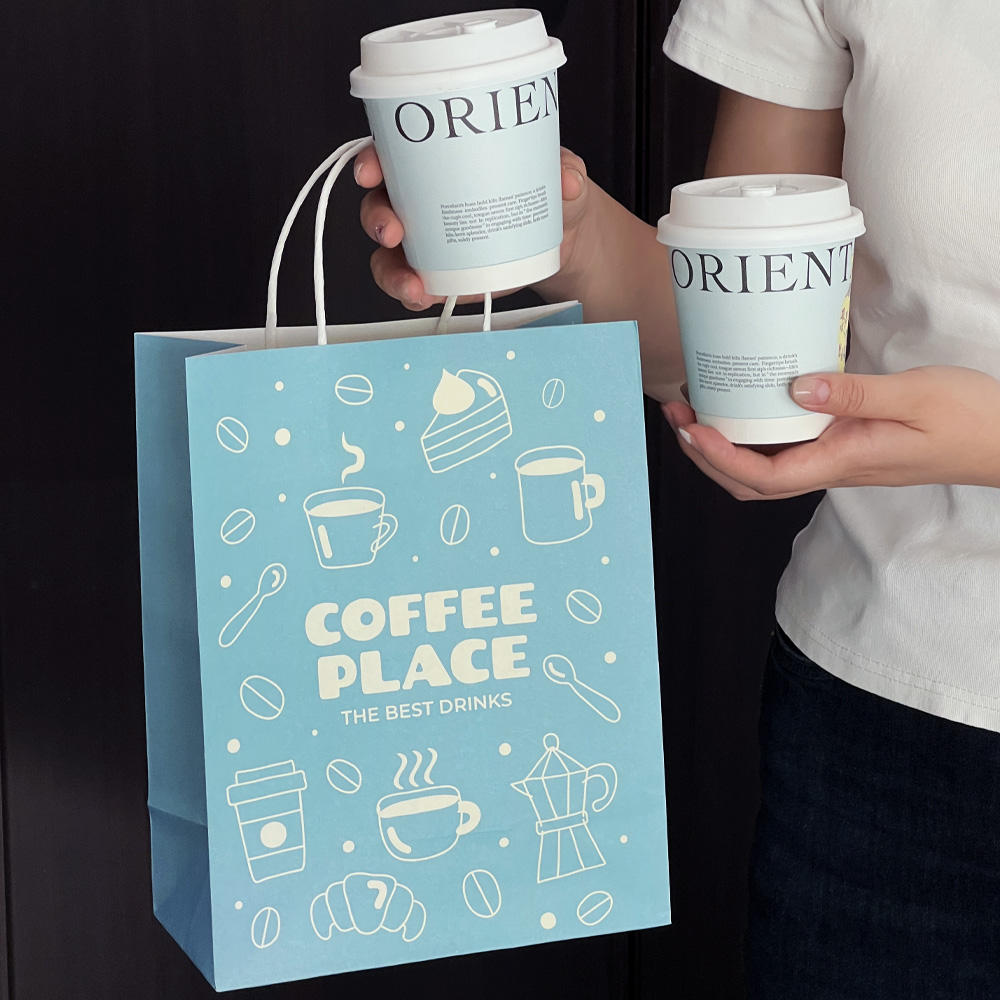 Brown kraft paper bags with handles for bakery bread and café takeaway drinks.