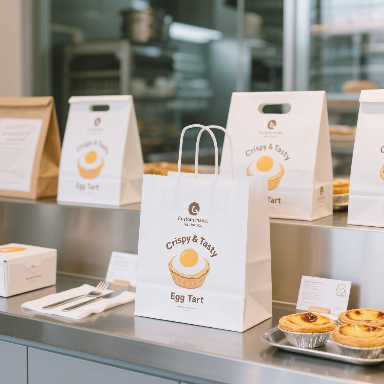 Brown kraft paper bags with logo printing used for coffee, milk tea, and cake takeaway packaging.