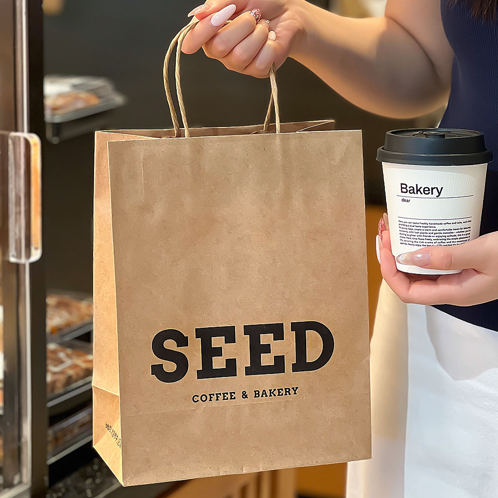 Brown kraft paper takeaway food bags designed for coffee, juice, and drink packaging with custom printed logos.