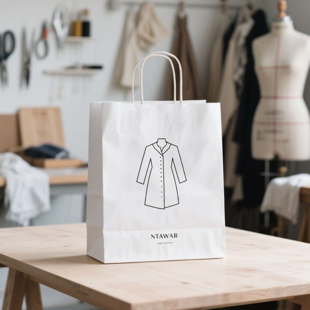 White kraft paper shopping bags with custom printed logos for apparel, socks, and retail clothing packaging.